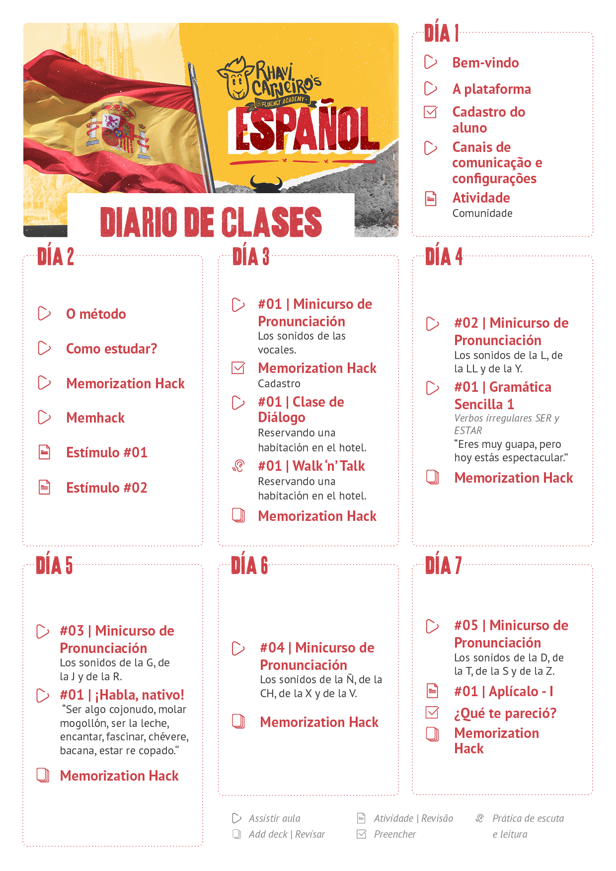 CADASTRO: Esse ícone indica que há um formulário a ser preenchido. Lembre-se: o cadastro do aluno é o seu registro oficial da Fluency Academy, então preencha com seus dados atualizados para que possamos entrar em contato com você pelos números corretos. Já o cadastro do Memorization Hack só estará disponível com a liberação da primeira aula do minicurso. Todas as semanas, ao finalizar seus estudos, você deverá preencher o Diario de Clases, que é o seu "diário de bordo", no qual você fará o registro da sua jornada semanal.